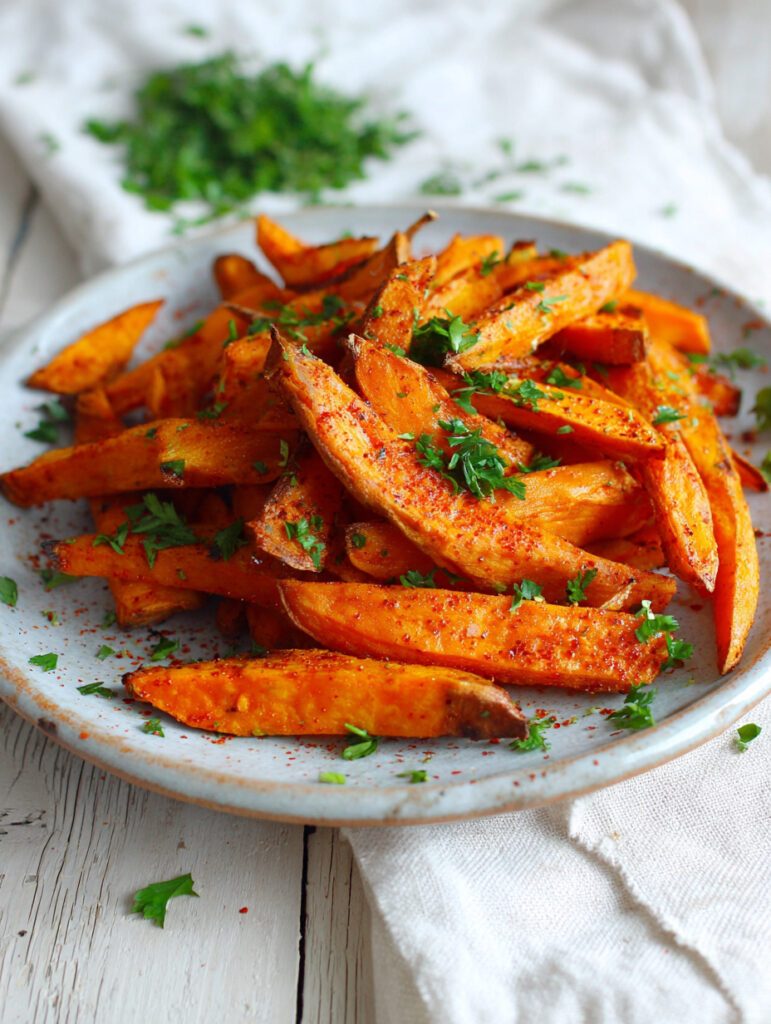Sweet potatoes are naturally rich in fiber, beta-carotene, and slow-digesting carbohydrates that help keep your energy steady. Baking them slowly at a low temperature preserves more nutrients, reduces the formation of acrylamide, and creates a softer yet crisp-edged texture that’s easy on digestion.